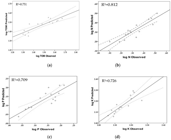 As the soil characteristics varied, determined by both external and internal factors [48]. After the model was selected, model testing with 15 comparison samples was conducted. The results showed that all selected models performed well in this area by comparing the observed concentration of TOM, N, P, and K in east part of the study area with their predicted values by the selected models (Figure 2). Model fit was graphically depicted with 95% confidence limits. The R2 of models were 0.751, 0.812, 0.709, and 0.726, respectively. Finally, the reference conditions for four variables by the regression model method were 42.30 g/kg, 2.47 g/kg, 2.13 mg/kg, and 295.07 mg/kg, respectively.