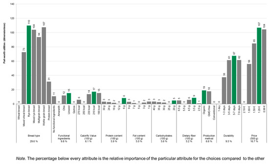 To identify consumers’ average preferences in terms of type of bread, functional ingredients, calorific value, protein content, fat content, carbohydrates, dietary fiber, production method, durability and price, the Hierarchical Bayes model was used. The columns in the Figure 2 illustrate the estimated part-worth utilities for each level in the relevant attribute group; a higher part-worth utility represents greater benefit for the consumer. This, in turn, indicates a greater likelihood of purchasing the chosen product. The lowest part-worth was set to zero in each attribute group; this was implemented to achieve better comparability of the level effects.