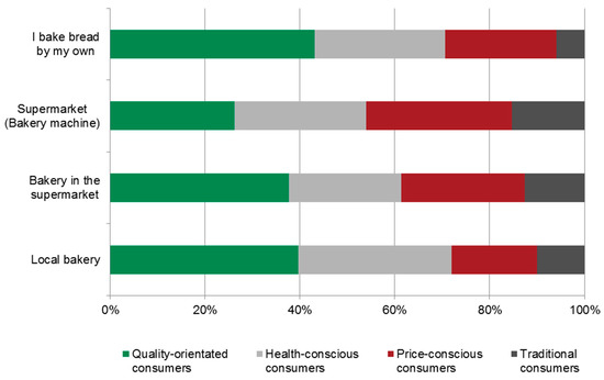 Price-conscious consumers selected the bakery machine in the supermarket as their favored purchase location. Due to their distinctive price awareness, local bakeries are less frequented by this group. Finally, traditional consumers represent the smallest group. Figure 3 clearly shows that a traditional consumer would first buy bread in the supermarket (bakery machine), followed by the bakery in the supermarket. It is notable that the percentage of consumers choosing ‘local bakery’ and ‘I bake bread myself’ are significantly low for this segment.