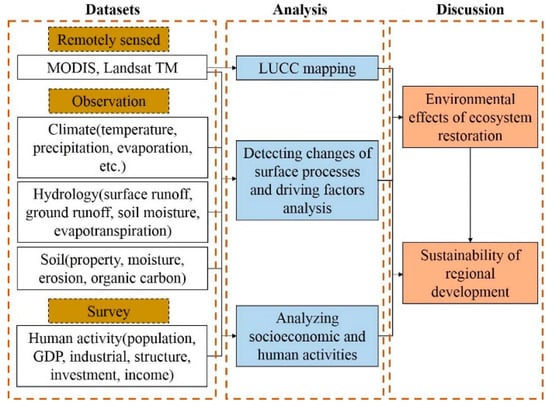 Previous studies are mostly based on single-sided research or research focusing on the impact of a single environmental factor. Comprehensive research is still rare, and our understanding of LUCC processes in terms of land use and environmental factor interactions and the maintenance of regional sustainable development remains restricted. Based on ecological restoration projects (“Grain for Green”) implemented since the 1980s and climate change observed in recent years, we analyzed the spatial and temporal characteristics, driving forces and environmental effects, especially ecological hydrology process of LUCC and discussed strategies for maintaining regional ecological, economical and socially sustainable development. The paper is structured as follow (Figure 1): the spatial and temporal characteristics of LUCC from 1980 to 2015; LUCC driving forces, (including climate change and human activities); environmental effects (like ecological hydrology, soil moisture, soil erosion and carbon cycle); and sustainable development of regional ecology (economic and social). The objective of this research is to provide a scientific basis for regional ecological environments and water resources management.