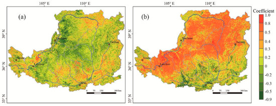 Relationship (partial correlation coefficient) between NDVI and different climatic factors: (a) NDVI and temperature; (b) NDVI and precipitation.