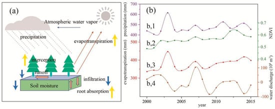 Ecological hydrology and vegetation restoration: (a) Schematic of terrestrial ecosystems water cycle after vegetation restoration; (b) Precipitation (b1), NDVI (b2), actual evapotranspiration (b3, data from the literature [47]) and difference of river discharge at the Huayuankou station (outlet) and Lanzhou station (the Yellow River inlet of the Loess Plateau) (water discharge = water discharge in Huayuankou − water discharge in Lanzhou) (b4).
