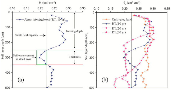The water supply factor is the most important limiting factor in the Loess Plateau for vegetation recovery. The water balance indicator of the difference between evapotranspiration and precipitation was introduced to demonstrate the sustainability of vegetation water use in the Loess Plateau. Precipitation is the main source of water input while evapotranspiration and runoff are the main sources of water output in the Loess Plateau. From above, we know that water consumption had already exceeded the water yield within the Loess Plateau from 2000. So, vegetation restoration will reduce soil moisture, especially in the regions of vegetation improved significantly or forest planted exotic species [26]. Soil is an important part of terrestrial ecosystems, and LUCC causes soil water to be redistributed in the soil system. After vegetation restoration, soil water absorption was increased by plant roots and plant transpiration increased, resulting in a lower soil moisture content than the field stable water holding capacity (Figure 8a). Soil moisture is related to land use types, vegetation restoration years, and vegetation types. According to the analysis of a large amount of monitoring data, the average soil water content decreased after the conversion of cultivated land on the Loess Plateau, and the soil water content on cultivated land was highest, followed by shrub and arbor forest land [30]. The soil moisture decreased with increasing years of fallowing. The soil moisture in the land after cultivated land was returned to forests after 10, 20 and 32 years showed decreases of 10%, 17% and 8%, respectively. Differences in soil moisture were observed under different tree species types. For example, the soil moisture was significantly lower in Pinus tabulaeformis and Robinia pseudoacacia forests than in Caragana korshinskii, and Pinus tabulaeformis and Robinia pseudoacacia were the main species involved when farmland was returned to forest on the Loess Plateau [26].