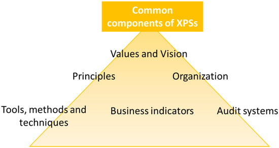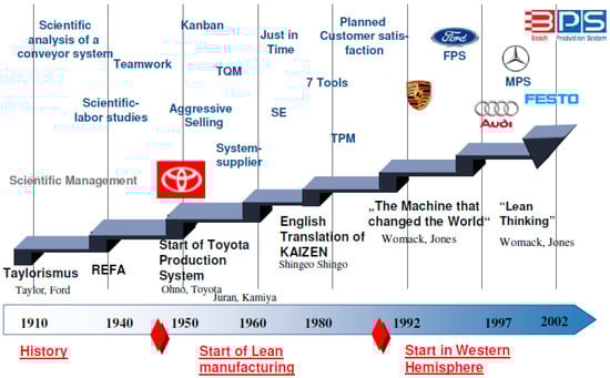 Soliman [] describes TPS as a house, with all the components coherently implemented in order to hold up its structure (see Figure 2). In the most simplistic definition of TPS, all manufacturing activities are divided into either adding value or creating waste. The goal of TPS is then to maximize value by minimizing waste, applying the principles and elements shown in the house. Although TPS is probably the most famous XPS, there were other manufacturing models before, such as Taylorism (or Taylorismus) []. Figure 3 shows the chronological evolution of the most important XPSs.