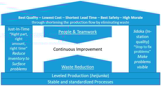 Despite some definitional variations, several prominent authors (e.g., in References [,]) define manufacturing models as sets of managerial items designed to manage and improve manufacturing units, which are composed of six essential elements (see Figure 1: (1) values and vision; (2) principles; (3) tools, methods, and techniques; (4) business indicators; (5) organization; and (6) audit systems). Probably the best-known manufacturing model is the previously mentioned TPS or “House of Toyota”, composed of the elements shown in Figure 2.