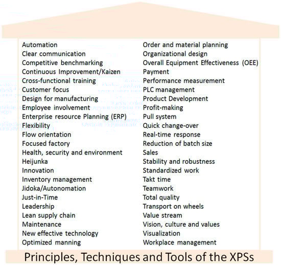 Due to the success of TPS, and other models coming mainly from Japan, manufacturing models appeared massively in the industry during the 1980s. Currently, the great majority of relevant corporations in the industrial world have their manufacturing XPSs or “houses”. These models have differences between them, as they rely on distinct principles, values, and tools. In an effort to understand the components of different XPSs, Netland [] identifies 46 different principles, tools, and techniques (see Figure 4), a selection of which is used by each company to tailor its lean manufacturing model.
