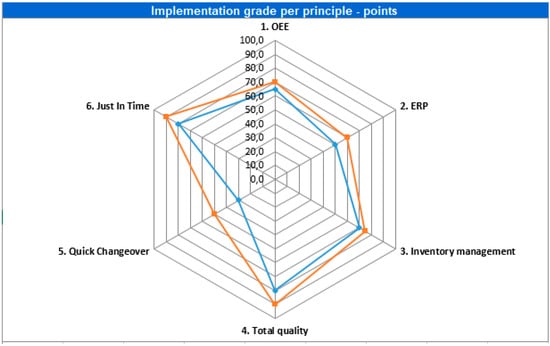 Regardless of the format and content of each checklist, quantifying the qualitative progression of multiple lean factors in each dimension is essential. A wide range of scoring methodologies can be used, such as simple Yes/No or Likert scales. In any case, it is necessary to obtain unique final audit values for any indicators shown in the radar of Figure 5.