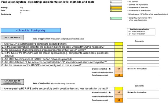 As can be seen in Figure 5, it is typical in XPS audits not only to obtain a mark for each of the principles audited, but also to establish new objective values for the next year. These marks were obtained by interviewing plant directors using this type of XPS audit model, where both quantitative and qualitative data were gathered. Specifically, each of the components in the radar was divided into sub-concepts, as shown in Figure 6. In that Figure, we can see how the mark of the Total Quality principle was obtained by applying a questionnaire. In this specific case we can see that the mark was given by evaluating how the plant implements the HACCP (Hazard Analysis and Critical Control Points) tool, and how it deals with BRC (British Retail Consortium audit system) and IFS (International Featured Standard) audits, among others. (Note that it is not possible to provide more information regarding the XPS partially shown in Figure 6 due to confidentiality reasons.)