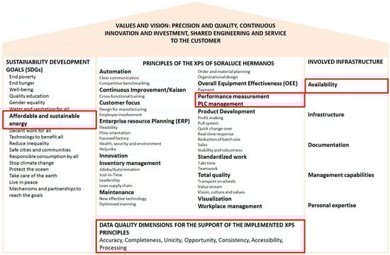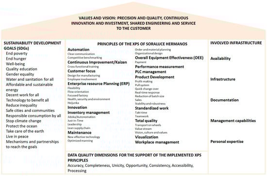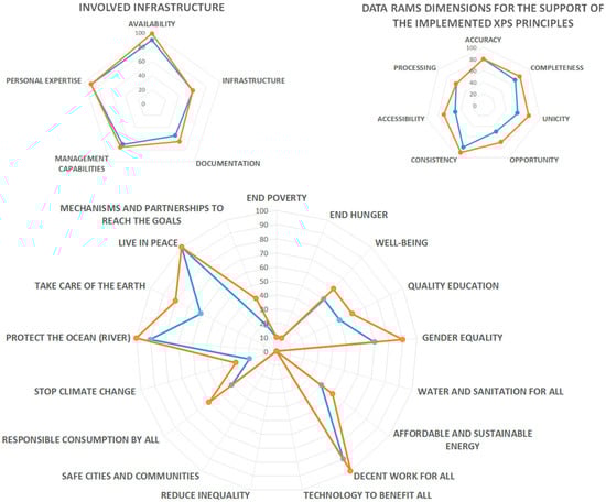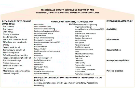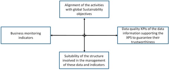 The three components complementing the XPSs in this framework were based on references [] for data quality and [] for IT infrastructure, whereas it used the previously mentioned SDGs of the UN for the sustainability component. The specific concepts commented in the references analyzed for each of the components are as follows. For data quality Reference [] shows as key concepts: (a) accuracy, (b) completeness, (c) uniqueness, (d) opportunity, (e) consistency, and (f) accessibility. Nevertheless, the attribute of processing-easiness was incorporated, as this component is needed when dealing with big data environments []. In fact, this type of environment is already quite frequent in the industry and this trend is expected to increase. Regarding infrastructure, the audit component was based on Reference [] and remarks as key components: (a) availability, (b) infrastructure, (c) documentation, (d) management capabilities, and (e) personal expertise.