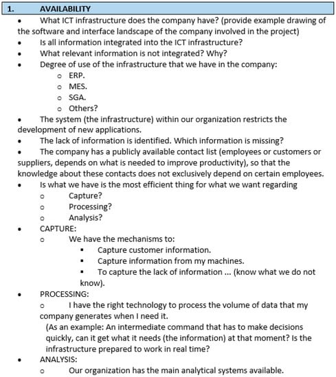 The questionnaire produced a multi-dimensional space of indicators regarding lean manufacturing, data quality, IT infrastructure, and sustainability. There will often be dependencies appearing between the different ratios in the various indicators (e.g., data quality and lean manufacturing). It was therefore essential to employ a single panel for all the audited items, which allowed visual correlations to be established between the ratios. Low marks in IT infrastructure, for instance, may lead to lower marks in data quality too. The questionnaire also allowed the company to reconsider the prioritization of actions. The audit results may indicate, for instance, very low marks in items previously considered to be of secondary importance, urging the company to move them up in the priority ladder. Take, as an example, the items “availability” and “documentation” under “involved infrastructure” (see Figure 8). Availability could, a priori, be considered to be more important than documentation, since the latter is an instrument to potentiate the former. If the obtained mark for documentation is much lower than that for availability, however, the company may find it optimal to prioritize actions in order to improve the quality of documentation.