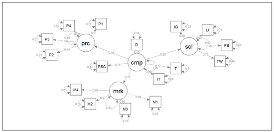 Marketing innovations as a third group of latent variables contain four variables. These variables are measured through the objectives for marketing innovations. The questions were, respectively, for variables M1, M2, M3, and M4: “How important was the objective to increase awareness of the existence of a product/service for marketing innovations?”; “How important was the objective to increase or maintain market share for marketing innovations?”; “How important was the objective to introduce products to new customer groups for marketing innovations?”; and “How important was the objective to provide basic information about the product/service for marketing innovations?”. The values are formed from 1–4 based on the possible answers (High, Medium, Low, and Not Relevant, respectively).