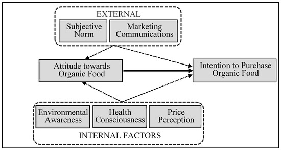 According to Biel and Thøgersen [24], attitude is regarded as a central predictor of consumers’ intention to buy organic foods, which is due to significant factors, such as environmental friendliness, animal health, and personal wellbeing. While many external factors (e.g., subjective norms and marketing communications) influence organic food consumption [9], internal factors mainly concern environmental awareness, health consciousness, and price perception [25,26]. Based on a review of former studies, these studies deliberated particular factors that are likely to influence attitudes, and proposed hypothesis based on each concept.