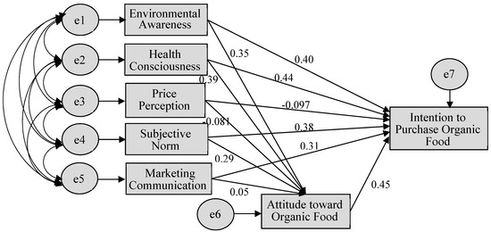 The path coefficient shows the direct effect of a variable that has a path relationship between constructs in a model (Chin, 2010). The path results of SEM are shown in Table 4, which shows that the t-value for the paths of H1 (5.752), H2a (2.934), H4a (5.857), H5a (6.013), H2b (4.264), H3b (3.612), H4b (3.496), and H5b (5.614) are higher than the standard value. The hypotheses, that environmental awareness, health consciousness, and subjective norm will have positive influence on the attitude of consumers, are supported, and the intention to purchase organic foods resulting from marketing communication is found to have positive impact on buying intention in this study. It was expected that price perception would have negative impact on consumer attitude and the intention to purchase organic foods; however, this study found no significant relationships.