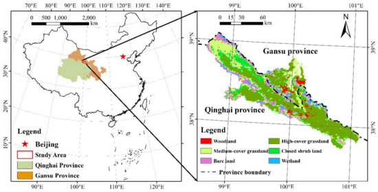 Our study site was located in the upper reaches of the Heihe River Basin. The Heihe River is the second largest inland river in China, originating in the Qilian Mountains and flowing into the Inner Mongolia Plateau. The upper reaches of the Heihe River Basin span between 37.7° N–39.1° N and 98.6° E–101.2° E. Total area is nearly 1 × 106 ha, with 20% located in Gansu Province, and 80% distributed in Qinghai Province (Figure 1). 98.53% of the study area belongs to unpopulated zone. Elevation in the area ranges from 1991 to 4741 m. The region has a typical continental monsoon climate with an annual average temperature of 2.3 °C and an annual average precipitation of 536 mm [35]. Affected by climate, topography and vegetation, the landscape exhibits vertical zones, with mountain deserts and grasslands below 2600 m, conifer/broadleaf mixed forest between 2600–2800 m, Qinghai spruce (Picea crassifolia Kom) forest and alpine shrub land between 3500–4500 m, and alpine desert and glacier above 4500 m [36]. Soil types also display a vertical distribution, with mountain grey calcic soil at 1900–2300 m, chestnut soil at 2300–2600 m, grey cinnamon and chestnut soil at 2600–3200 m, gray brown and mountain black earth soil at 3200–3600 m, alpine shrub meadow soil and alpine shrub grassland soil at 3600–4000 m, and cold desert soil at >4000 m [37].