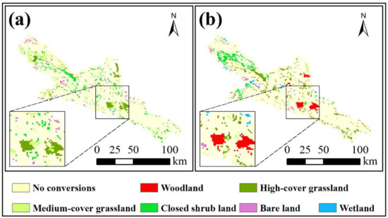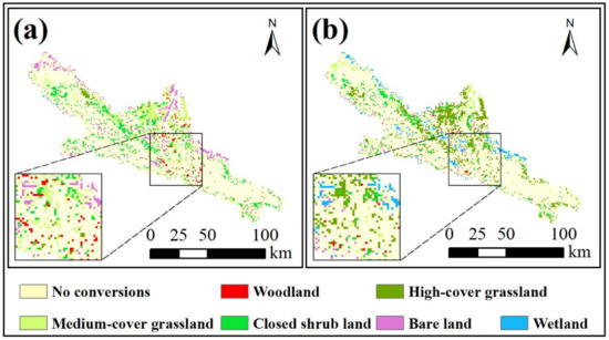 During the period 2001–2015, 25.56% of the total area was converted to other land cover types (Table 2) (Figure 2). The area of high-cover grassland comprised the largest proportion over the period of 2001–2015, at 34.75% in 2001, and at 44.44% in 2015 (Table 3). On the contrary, the area of medium-cover grassland experienced a strongly decreasing trend. Nevertheless, it accounted for the second largest proportion throughout the study period. Next, closed shrub land and bare land exhibited similar quantities. The area of closed shrub land showed a slightly increasing trend over the period of 2001–2008, then decreased rapidly by 18.54% over the second half of the study period. The area of unused land shrank by 24.15% throughout the study period. The least occupied areas were woodland and wetland. The area of woodland experienced a declining trend between 2001 and 2008, but it increased during the subsequent time interval. Wetland expanded substantially from 2001 to 2015 due to the implementation of Wetland Protection Program.