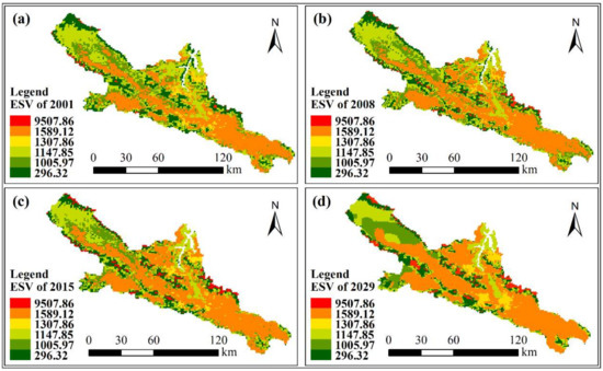 Changes in ESV ($) in the upper reaches of the Heihe River Basin from 2001 to 2029: (a) ESV in 2001, (b) ESV in 2015, (c) ESV in 2015, (d) ESV in 2029.