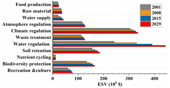 Due to land cover change, the total ESV of the study area increased from $1207.33 million (USD) in 2001 to $1479.48 million (USD) in 2015, and the value was expected to reach $1574.53 million (USD) in 2029. Along with those, the ESVs of 11 types of ecosystem services showed increasing trends to varying degrees, especially those of water and climate regulation due to expansions of wetland and high-cover grassland.