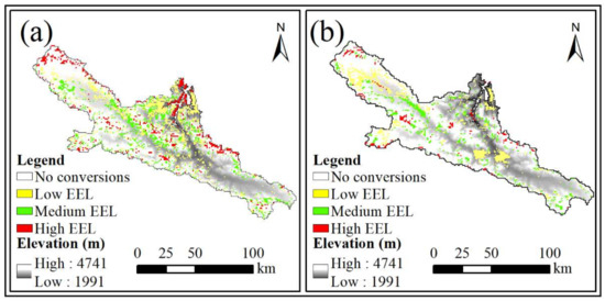 The EELs were categorized into three groups based on their distributions in the study area: EEL ≥ 1 was classified as high, 0.5 < EEL < 1 was classified as medium, 0 < EEL ≤ 0.5 was classified as low. The results showed that the EELs during the periods of 2001–2015 and 2015–2029 were 0.88 and 0.40, respectively (Figure 7), indicating that conversion of 1% of land cover area would result in 0.88% and 0.40% changes in ESV. Responses of ESV to land cover change were not very marked.
