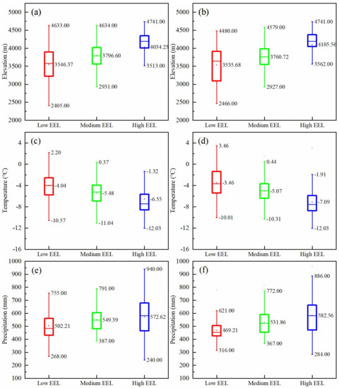 Distribution of EELs exhibited noticeable zonality (Figure 8). Namely, the higher the elevation, the higher the EEL. With an increase in elevation in the alpine area, the temperature decreased, while precipitation increased to varying degrees. Consequently, the distribution of EELs was negatively correlated with temperature, and positively with precipitation.