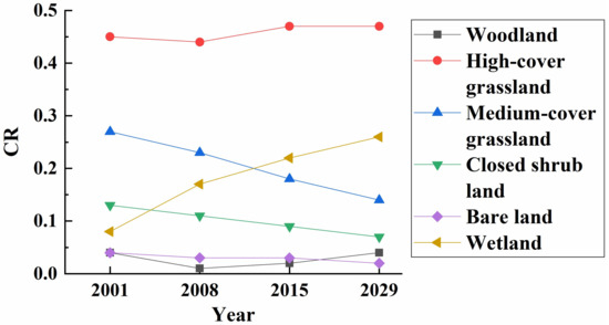 CRs (Figure 9) were calculated to measure the contribution rate of a land cover type to ESV. The results showed that CRs of high-cover grassland and wetland were relatively higher than those of other land cover types, partly because the area of high-cover grassland represented the largest proportion, and partly because its unit values were higher than those of other land cover types. Wetland CRs were expected to increase from 0.08 in 2001 to 0.26 in 2029 along with expansion of its area. Though the CR of medium-cover grassland was 0.27 in 2001, its value was expected to decrease to 0.14 in 2029. The CRs of other land cover types were close to zero. These results demonstrated that an accurate correction of coefficients of high-cover grassland and wetland were critical for the estimation of the total ESV in the upper reaches of the Heihe River Basin.