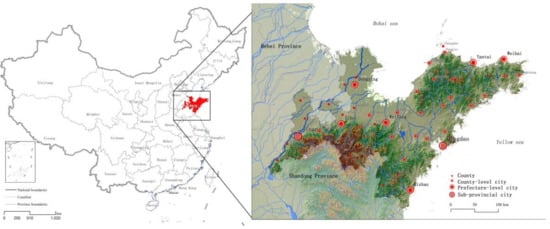 SPUA is located in the coastal area of eastern China, which contains eight cities (Jinan, Qingdao, Yantai, Zibo, Weihai, Weifang, Dongying, and Rizhao; Figure 1). The eastern and southern part of SPUA is a hilly landform, and the Yellow River delta plain in the middle. The rivers are densely, and the Yellow River, the second largest river in China, passes through the region and flows into the Bohai Sea from southwest to northeast. SPUA close to the Bohai and Huanghai seas, and has an area of 7.47 × 104 km2. To the south of the peninsula is the Yangtze River Delta UA, and to the north are the Beijing–Tianjin–Hebei UA and Liaodong Peninsula UA. The Korean Peninsula and Japan lie to the east of SPUA. As China’s frontier area involved in regional cooperation in Northeast Asia, the SPUA has a relatively high level of economic development based on industrial development. In 2017, the study area had a total population of 41 million. Meanwhile, according to the spatial distribution of economic activity, the research area has formed three centers of economic growth: Qingdao, Jinan-Zibo, and Yantai. SPUA is the important urban agglomerations in National 13th Five-Year Plan. Thus, strong emphasis should be placed on its optimization and improvement. Faced with typical problems related to LDIE, including relatively high intensity and low efficiency, the SPUA is a representative study area for urban agglomerations in China.