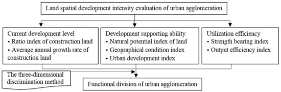 The land development intensity evaluation (LDIE) is conducive to optimizing land development and utilization. This complicated and systematic method has attracted attention from many scholars. Existing research is mainly focused on the current development scale, the identification of factors driving development [16], temporal-spatial differentiation and patterns of urban land expansion [17,18,19,20], the productivity and efficiency of construction land use [21,22], and the evaluation of development potential [23]. Three above conditions (i.e., scale, efficiency, and potential) should be simultaneously taken into consideration to achieve the goal of sustainable development. Development scale is described as the extent to which urban agglomeration land space is exploited, which means the mass of land development. Utilization efficiency reflects the efficiency of the developed urban agglomeration space, and potential reflects the area that could be further used for construction purposes. Although these three elements should be regarded as a unified whole, little research has considered all three elements. In a study on space exploitation and the division of a drainage basin, Wang (2012) established a three-dimensional distinguishing matrix model deals with the relationship of the spatial development constraint indexes, space development intensity indexes, and space development guidance indexes [24]. This method gives us a good idea, and we attempt to extend its research from the basin to the urban agglomeration in this paper.