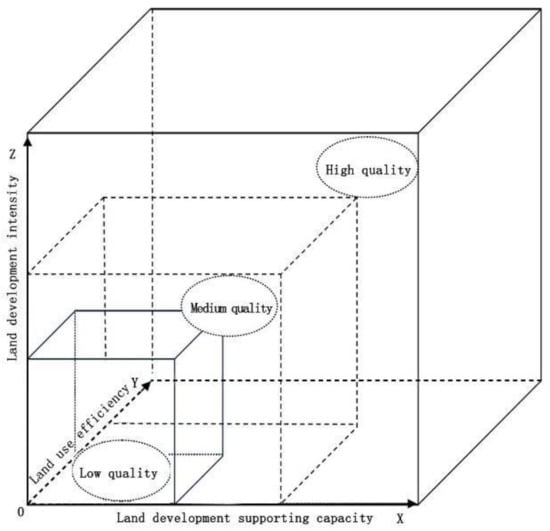 The three-dimensional discrimination method is widely applied in land development research. In this study, development and supporting ability was plotted on the x-axis, utilization efficiency was plotted on the y-axis, and development intensity was plotted on the z-axis. This results in a three-dimensional coordinate system for the evaluation of LDI. Three points at the same distance from the origin are selected to represent the levels of the three dimensions (high, moderate, and low). Vertical lines are created from these points to the three axes, forming a 3 × 3 × 3 isometric chart and 27 matrix units, among which each unit (x, y, z) stands for the combination of development intensity, guidance, and constraint (Figure 3).