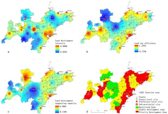 Based on the partitions, we compared the indices of development extent, development efficiency, and supporting ability of SPUA with those of other urban agglomerations. The maximum and minimum values were used to measure the threshold values of land development intensity for areas with different functions in the study area; thus, the results can be used to develop a regulation and control scheme.