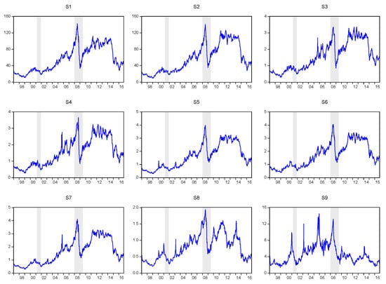 This paper aims to study the time-varying volatility feedback effects of energy prices on the level of energy returns by using the TVP-SVM model. We select nine energy products as the research objects (see Table 1) and further divide these nine products into three categories: crude oil (S1 and S2), petroleum products (S3–S8), and natural gas (S9). This paper uses weekly data for the nine energy products obtained from the U.S Energy Information Administration (EIA) (www.eia.gov). The full sample ranges from 10 January 1997 to 11 November 2016. We calculate energy returns by , where is the energy price at time t.