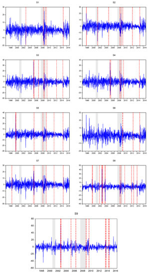 Firstly, using the ICSS algorithm, we test whether the structural break characteristics for the volatility of the nine major important products that exist in the energy market. Compared to the modified ICSS recently used, the ICSS proposed by Inclan and Tiao [32] can find more structural points and actual events can be found to correspond to these breakpoints. Since the ICSS algorithm can calculate the standard deviations among the breakpoints to determine the number of structural changes, the ICSS algorithm can perfectly capture the structural breaks of the energy price volatility. The return series of the nine energy product prices with the structural breakpoints for energy volatility corresponding with some major global economic and geopolitical events is illustrated in Figure 2. In addition, the periods of structural changes in volatility identified by the ICSS algorithm for WTI and Brent are shown in Table 3.