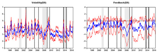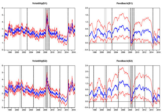 The price volatility (ht) and time-varying volatility feedback (αt) for WTI (S1) and Brent (S2) are shown in Figure 3. Note that WTI and Brent demonstrate the same volatility trend, and these two crude oil price volatilities reached their peak during the global financial crisis of 2008. Especially, in the second half of 2014, there was a significant increase in crude oil price volatility due to a tremendous drop in price. Furthermore, it can be seen from the right panel of Figure 3 that all crude oil price volatilities affect the time-varying feedback effect on crude oil returns positively, which means the greater the volatility of crude oil prices, the more likely the crude oil prices are to rise. The test results of the 90% confidence intervals show that the positive nexus between oil price volatility and oil returns is statistically different from zero during most of the sample time. This finding accords with the conclusion of Antoniou and Foster (1992) and Day and Lewis (1993) who have provided evidence that oil price volatility has a positive impact on the level of oil returns. However, they cannot detect the time-varying volatility feedback and provide more information that is useful for investors in the energy market. Our empirical results are not consistent with the finding of Chan and Grant (2016). They employ the constant coefficient SVM model and provide evidence that WTI crude oil price volatility affects WTI returns negatively during the sample period, from 3 January 1997 to 6 February 2015. The differences lie in the fact that Chan and Grant (2016) use a constant coefficient SV model, whereas we employ a TVP-SVM model that allows for time-variation on the impact of oil price volatility and that analyzes this structural instability better. Meanwhile, we find that the time-varying feedback effect of Brent price volatility is higher than that of the WTI price as a whole.