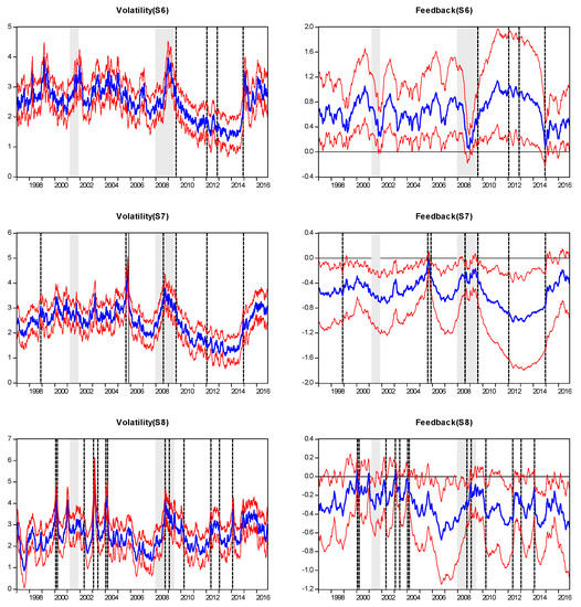 The results of energy price volatility (ht) and volatility feedback (αt) for diesel (S6), jet fuel (S7) and propane (S8) are presented in Figure 5. First, we note that diesel has similar volatility feedback dynamics with WTI and Brent crude oil. The time-varying parameter estimate of ht for diesel is positive and its 90% confidence interval excludes zero, indicating that the parameter estimate is significant and credible. We find that diesel price volatility affected its returns positively. At the location of the structural breakpoint, the diesel volatility has weak or not any effect on its returns if it reaches a peak. For example, the diesel price volatility reached a peak and yet the volatility feedback fell to the bottom close to zero during the global financial crisis in 2008. Likewise, in November 2014, this finding also can be proved. Second, in the case of jet fuel (S7), it shows that the price volatility of jet fuel has a significant and time-varying negative feedback effect on its returns. The corresponding 90% confidence intervals are excluded from zero, and the estimated results are significant. Besides, the volatility feedback effect of the jet fuel price on its returns shows the characteristics of a structural break. For instance, during the Iraq war, the volatility of jet fuel has two breakpoints in 2005. Under the location of breakpoints, the price volatility reaches a peak, whereas the volatility feedback effect gradually declined and neared to zero. All these indicate the volatility lost its effects on the returns. Similarly, when the global financial crisis broke out in 2008, the feedback effect of jet fuel price volatility on its returns reached an extremum (the feedback level less than zero), which indicates that the volatility has a smaller impact on jet fuel returns. Third, we can easily find that the propane price volatility (S8) has a negative effect on its returns. However, when considering the 90% confidence interval, most of the time it includes zero, which suggests that the estimated results are inaccurate.