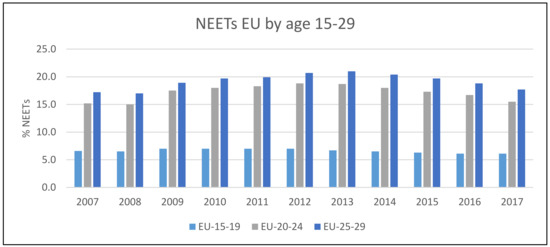 At the Luxembourg Summit (1997), the European Employment Strategy was adopted. Its main objective was to achieve progress over a five-year period, especially with regard to youth unemployment [4], and this issue continues to be the main concern, as is reflected in the importance given to it in the European Agenda 2030. Moreover, if the amount of NEETs is high, as Quintano, Mazzocchi, and Rocca (2008) [5] stated for the case of Italy, it could represent a social alarm because it could become an obstacle to economic growth, hampering productivity and competitiveness for the whole country, especially when this condition persists for a prolonged period [4]. The rate for young people neither in employment nor in education or training (NEETs) is closely linked to economic performance and the business cycle, but also related to labor policies and social protection. The NEETs rates in the EU-28 in 2016 were 6.1% for people aged 15–19, 16.7% for those aged 20–24, and 18.8% for those aged 25–29. Figure 1 reflects the importance and evolution of the percentages of NEETs. It is shown that there is a great difference attending age groups, and that for the youth from 25 to 29, this is an essential issue, since for 2013 and 2014, the incidence was 21.6% and 21.2%, respectively.