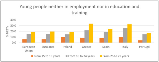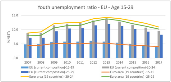 The economic and social situation of many countries has been so much affected that a decade later they have barely managed to recover the levels of wellbeing prior to the economic crisis. This situation has particularly hurt the countries of the south of the European Union, belonging to the Euro area, which have not been able to use the mechanisms of monetary policy to deal with the crisis situation. This is the case of Greece, Portugal, Spain, and Italy [5,16,21]. The evolution of the incidence of NEETs (provided in Figure 5) seems to remain equal across time and it appears with a quite similar patron both for the whole EU and for the Euro area. The unequal sectorial result of the dynamics of labor supply and demand became imbalanced in the labor market and has worsened in recent decades. The significant presence of very intensive sectors in unskilled work (construction or tourism) explain the high volatility of employment, as was seen in some southern European countries, for example, in Spain [16,22]. However, this situation in the labor market was similar to what happened in other areas of the economy. Specifically, the general environment, due to the policies adopted in those countries to deal with the economic situation, which have been accompanied by restrictions on public spending on fundamental aspects, such as health [23] and education [24]. As a result, some social groups, like today’s youth, who were in their childhood or adolescence at the time of application of these policies and, therefore, have been affected by them, are at risk of being part of the NEETs group. It is important to try to avoid this risk, since the NEETs “are exposed to a high risk of poverty and social exclusion, as they cannot improve their skills and competences, losing competitiveness” [5].