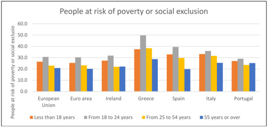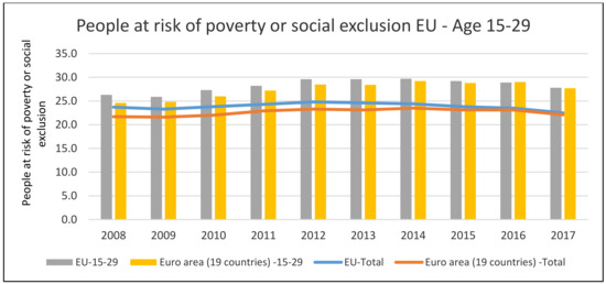 The risk of poverty and exclusion in the European Union is higher the younger the population is, as can be seen in Figure 4 and Figure 6, where the EU, Euro area, and the countries more affected by the economic crisis, are shown for the people at risk of poverty or social exclusion and the NEETs, respectively.