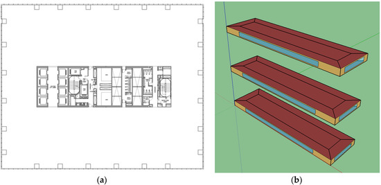 Modeled office buildings: (a) Shell and core typical plan; (b) simulation model of the building model with its thermal zones.