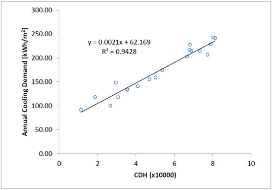 Linear regression for prediction of annual cooling demand with the use of CDH (base temperature = 18 °C).