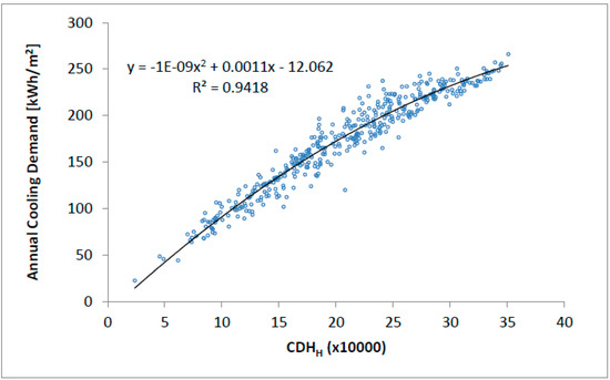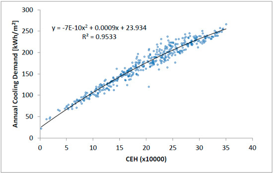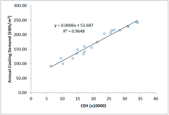 Figure 4 shows the graph that illustrates the correlation between CDHH and annual cooling demand, where the value obtained for R2 was 0.9418, and the standard error was 12.27 kWh/m2·year. Figure 5 shows the correlation between CEH and annual cooling demand, where R2 was 0.9533, and the standard error was 11.00 kWh/m2·year.