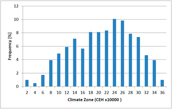 Frequency distribution graph of the 407 cities in the 18 climate zones obtained from CEH values.