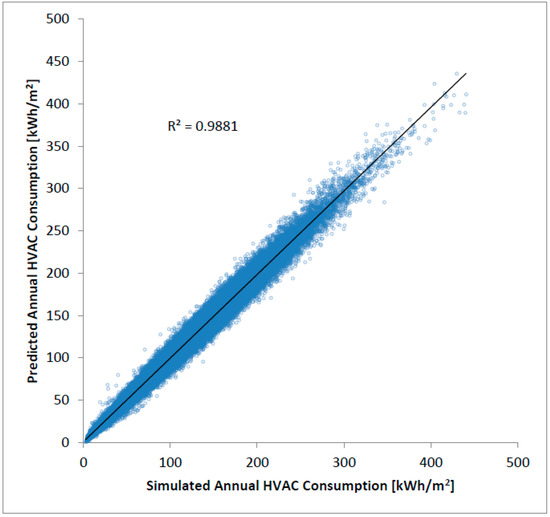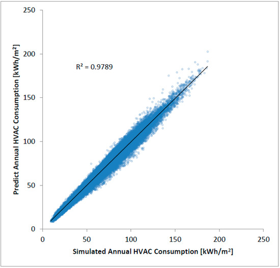 The number of cases determined by the possible combinations of these values amounted to 526,727,577,600,000 cases. The simulation of all cases is impracticable, and therefore it was necessary to perform a sampling. The sample size was determined for estimating a population mean [35] (considering large population) with the confidence level of 99% and desired margin of error equal to 0.5% of the standard deviation of the variable of interest (annual HVAC consumption). The value of this standard deviation obtained in the 126,976 previous simulated cases was 29.64 kWh/m2. Thus, the sample size obtained by the calculations was 265,225 cases, and 250,000 cases was the sample size adopted. The method of sampling was the Latin hypercube [36] because this method of sampling was more accurate and with less variance than those obtained with the Monte Carlo method [37].