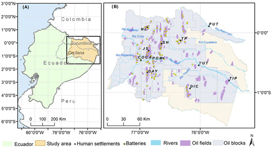 (A) The NEA in Ecuador; (B) study area within the two NEA provinces of Sucumbíos and Orellana including oil fields and oil separation batteries. The names of the human settlements represented are abbreviated: DAY = Dayuma; NL = Nueva Loja (aka. Lago Agrio); SH = Shushufindi; TP = Tarapoa; PUT = Putumayo; COCA = Puerto Francisco de Orellana; JS = Joya de Los Sachas; YUT = Yuturi; DI = Dícaro; TP = Tiputini.