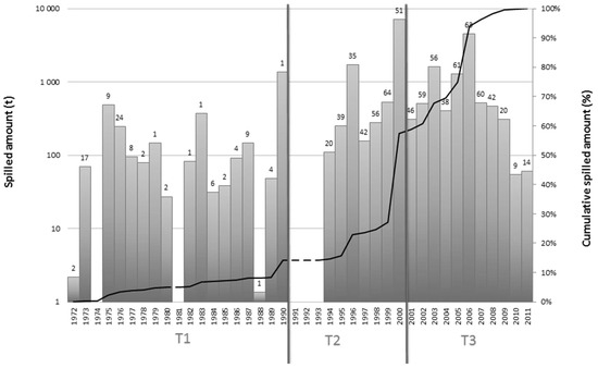 Number of accidental oil spills per year (individual values shown at the top of each bar) and the corresponding cumulative percentages relative to the total spill volume over the whole period. No datum was recorded from 1991 to 1993 (departure of Texaco).