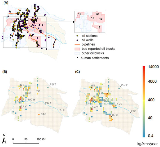 Pollution hotspots could be identified from the two oil spill maps (Figure 3B,C). Joya de Los Sachas displays the highest level of pollution, but other sites also exhibit high levels of spills such as Yuturi, Dayuma, and the area from Shushufindi to Nueva Loja. Owing to the spill volumes allocated to poorly-documented blocks, Dícaro and Tarapoa appear as potential areas of concern too. Ongoing research aims to combine maps depicting the impacts to the different environmental compartments (atmosphere, pedosphere, and hydrosphere) and classify them by pollutants (e.g., black carbon, total hydrocarbons, heavy metals) from different sources (accidental oil spills, mud drilling pits, and gas flares).