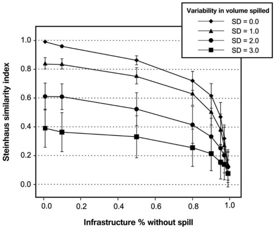 Variations of the Steinhaus index assessing the similarity between observed and estimated oil spill volumes across a simulated area of 23,550 km2, as a function of different sources of heterogeneity. This highlights the influence of variabilities in incident rates (i.e., spills evenly distributed across infrastructures vs. concentrated among a small proportion of infrastructures) and in the volume of oil spilled per incident.