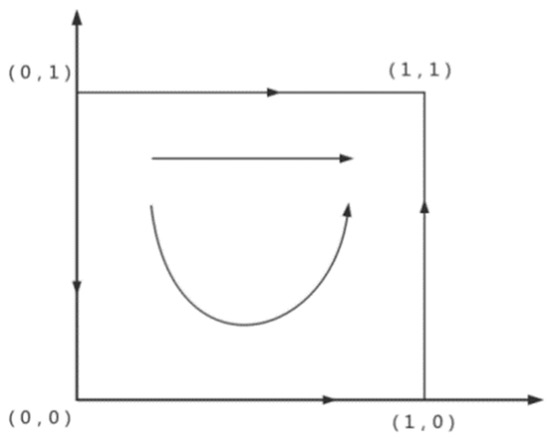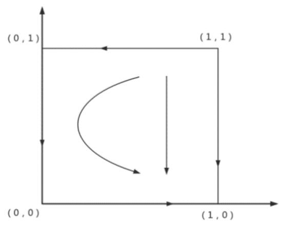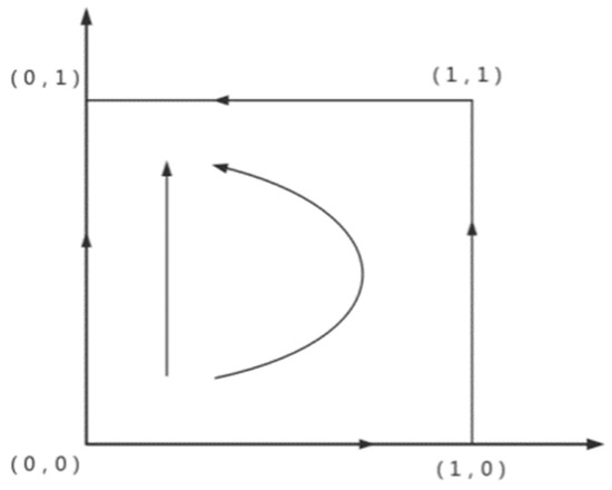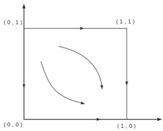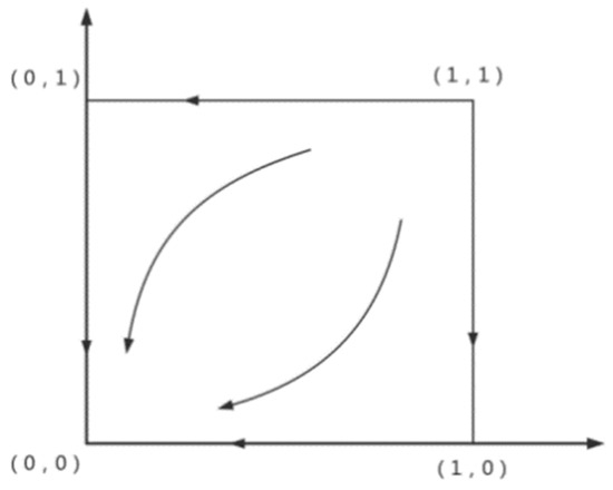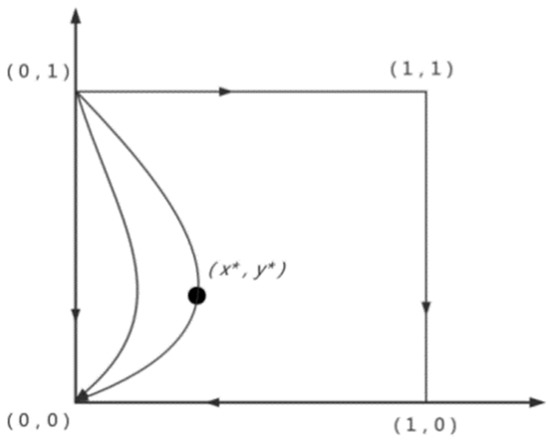 Scenario 5: When , and , the ESS is (1, 0). The stability analysis of local equilibrium points and the phase diagram under Scenario 5 are respectively shown in Figure 5 and Table 5.