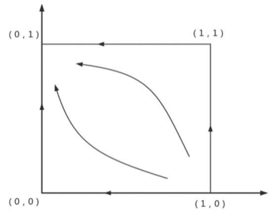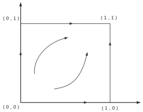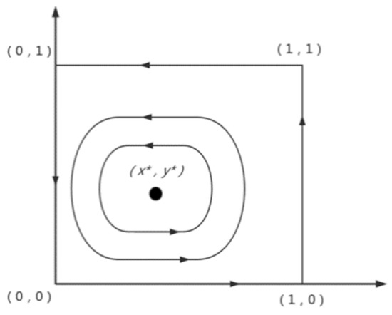 Scenario 9: When , and , the ESS point is (1, 1). The stability analysis of local equilibrium points and the phase diagram under Scenario 9 are respectively shown in Figure 9 and Table 9.