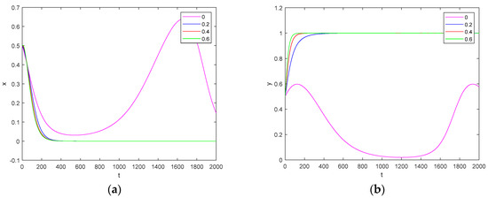 The dynamic changes in the proportions of different strategies chosen by the both parties throughout the entire process are the core of the evolutionary game theory. The change rates of proportions can represent the main feature of the dynamic change. The replicator dynamic equation that determines the proportion of strong governmental supervision can be expressed as Equation (7), where denotes time and means the change rate of proportion of strong supervision chosen by the governments ().