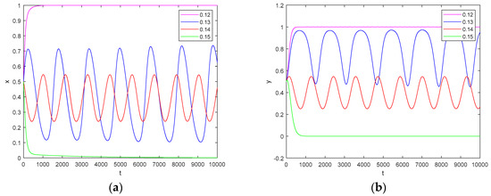The five local equilibrium points of the above system are respectively E1 (0, 0), E2 (0, 1), E3 (1, 0), E4 (1, 1) and E5 (, ), where