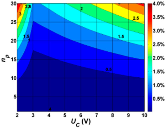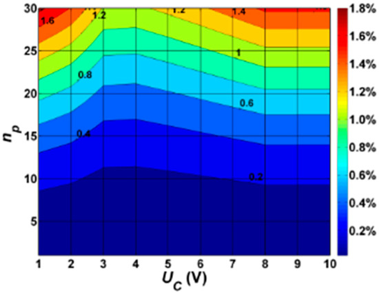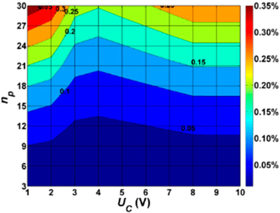 Based on the results of calculations obtained for a circuit composed of 30 LUM1 luminaires (Table A2), it is concluded that the percentage of total active power losses ΔPTOTAL decreases from 0.293% for UC = 10 V to 0.204% for UC = 4 V. Then, they increase to 0.386% for UC = 1 V. Based on the analysis of the percentage share of power losses in individual elements of the road lighting installation, it is stated that the biggest share is in cable losses. They are respectively 91.294% for UC = 10 V and 78.193% for UC = 1 V. There is also a significant increase in active power losses in the neutral conductor for dimming voltages UC ≤3 V. As mentioned earlier, this is due to the increase in the content of higher harmonics of the luminaire currents, along with a reduction in the level of dimming. The maximum percentage value of ΔPNEUTRAL is over 21% with respect to ΔPTOTAL. Power losses in the other elements of road lighting installations are in the order of 1%. The dependence of the percentage of total active power losses ΔPTOTAL as a function of the dimming and the number of lighting points is shown in Figure 2.