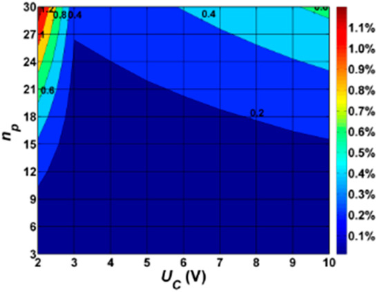 In Table A1, there are results of calculations of active power losses for a road lighting installation composed of three LUM1 luminaires. Based on the analysis of the obtained calculation results, it can be concluded that the percentage of total active power losses ΔPTOTAL related to the installed power Pkc decreases as the level of the dimming decreases from 0.013% to 0.009% for UC = 4 V. Then, these losses are increased to 0.016% for UC = 1 V. The increase in the value of ΔPTOTAL is related to the increase in the level of disturbances in the form of higher harmonics generated to the power supply network. This is illustrated in Table 1, which lists the changes in the THDI coefficient. In turn, this results in an increase in power losses, especially in the neutral wire ΔPNEUTRAL. The maximum share of losses in the neutral conductor in ΔPTOTAL is 7.872% for UC = 2 V. It should also be noted that for a three-luminaire circuit, the losses in the cable connecting the pole panelboard and the ΔPWIRE luminaire are larger than the power losses in the power cable. Power losses in the ΔPPPOLE label range from 10.543% to 11.115%. Power losses in other elements of the installation do not exceed 2.5% in relation to ΔPTOTAL. It can therefore be assumed that the active power losses at the point of light (ΔPWIRE + ΔPPPOLE) are in the range from 56.015% for UC = 10 V to 53.131% for UC = 1 V. The sum of total losses ΔPCABLE + ΔPNEUTRAL + ΔPPPB + ΔPRELAY in the power cable, the protection from the panelboard, the relay and the neutral conductor are respectively 43.985% for UC = 10 V and 46.870% for UC = 1 V.